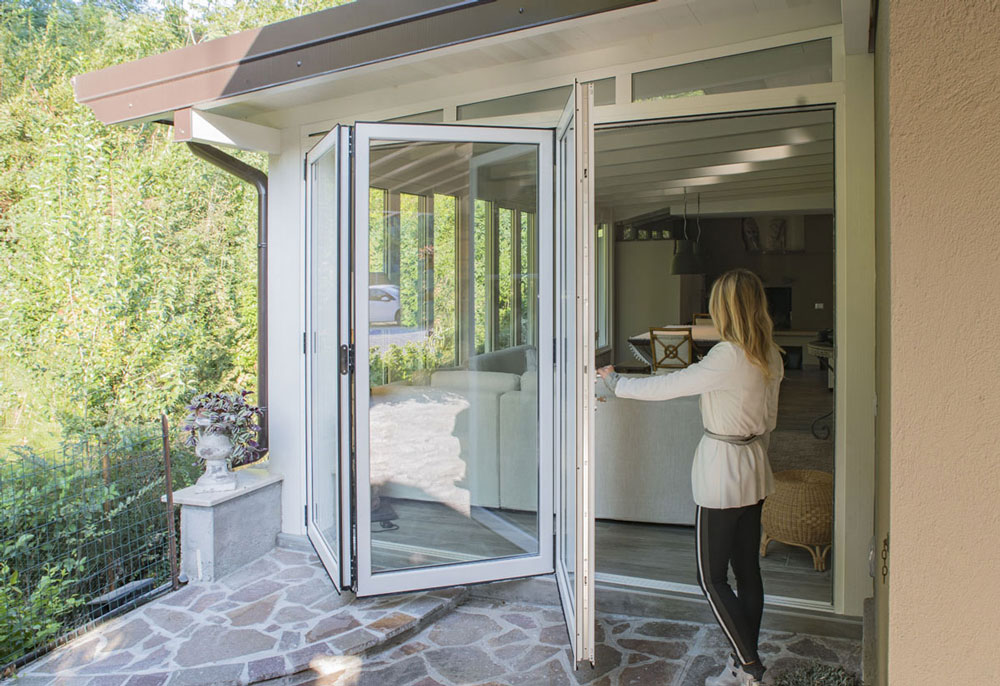 La vetrata con apertura a libro è stata realizzata con profilo ALUK e consente di avere la massima apertura per godersi a pieno anche l'esterno della veranda.